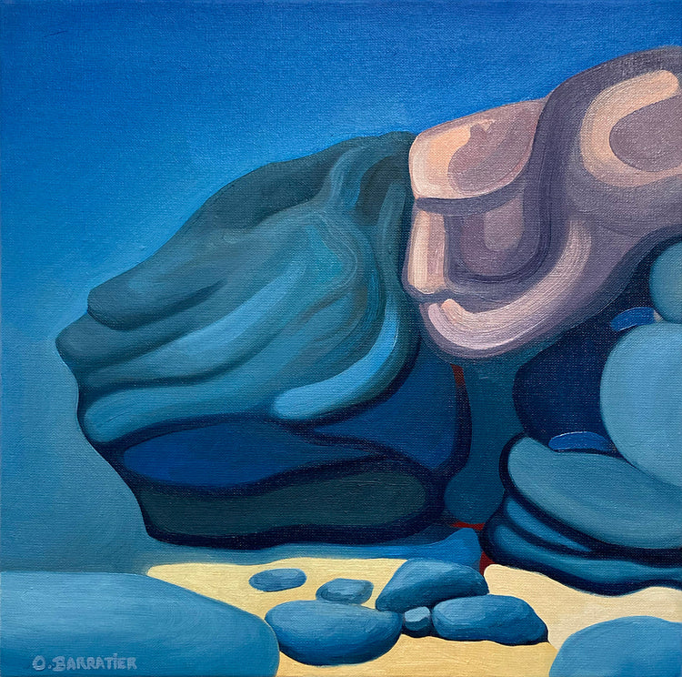 Au fil de longues promenades sur les plages de Saint Jacut de la Mer, dans une solitude quelque peu forcée par les événements, j’ai dû réapprendre à regarder ce paysage que j’avais connue adolescente. La mer, le sable, les rochers. Après plus d’un quart de vie passé sous le soleil californien, ces sont les rochers qui ont accroché mon regard, ces êtres lunaires. Ces sont eux qui ont ancré mon esprit, donné à mon inspiration son élan. Les questions qui suivirent, de nature ésotérique, révélèrent des mystères qu’au biais de la peinture j’ai tenté d’élucider… Les rochers ont-ils une âme, sont-ils habités d’un esprit ? La réponse que je donnerai est certainement ‘oui’.